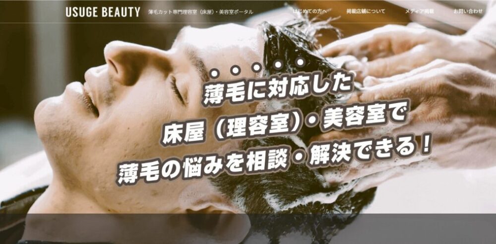 “薄毛ビューティ” のサイトご紹介 USUGE BEAUTY(薄毛ビューティ)のサイト内容のご紹介をさせていただきます。 USUGE BEAUTY(薄毛ビューティ)は薄毛用の床屋(理容室)・美容室を掲載するポータルサイトです。日本には床屋(理容室)が11万件以上あり、...