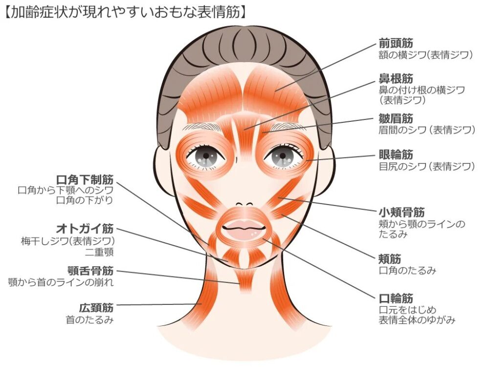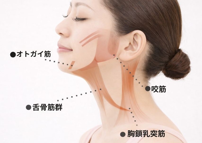 • あご周りのもたつきの大きな要因の一つとして挙げられるのが、顔の土台となる「表情筋」や、舌を支える「舌骨筋群」の衰えです。