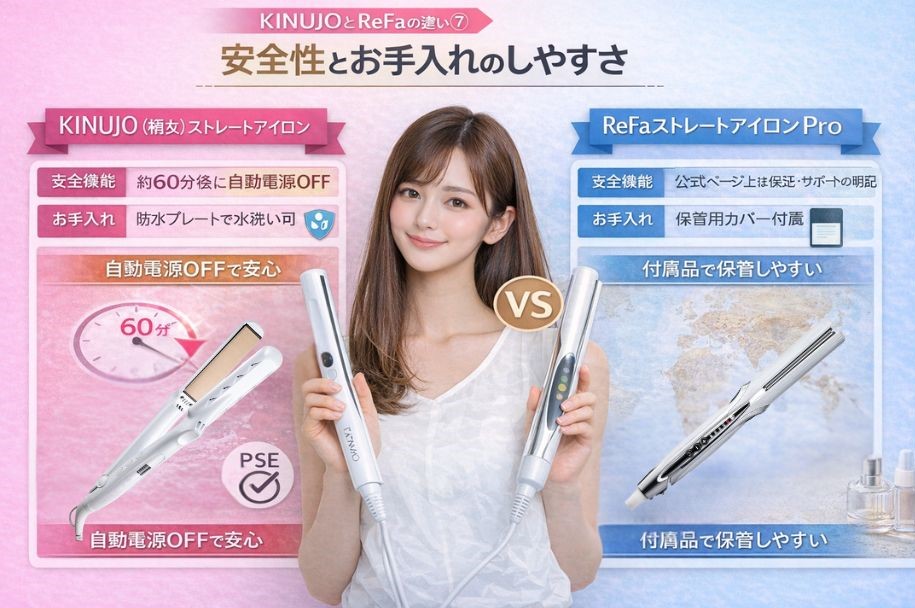安全面はどちらも取扱説明書の注意に沿って使うのが前提ですが、KINUJO(絹女)ストレートアイロンは機能で支える安心感、ReFaストレートアイロンProはサポートや付属品で支える安心感、という見え方になっています。