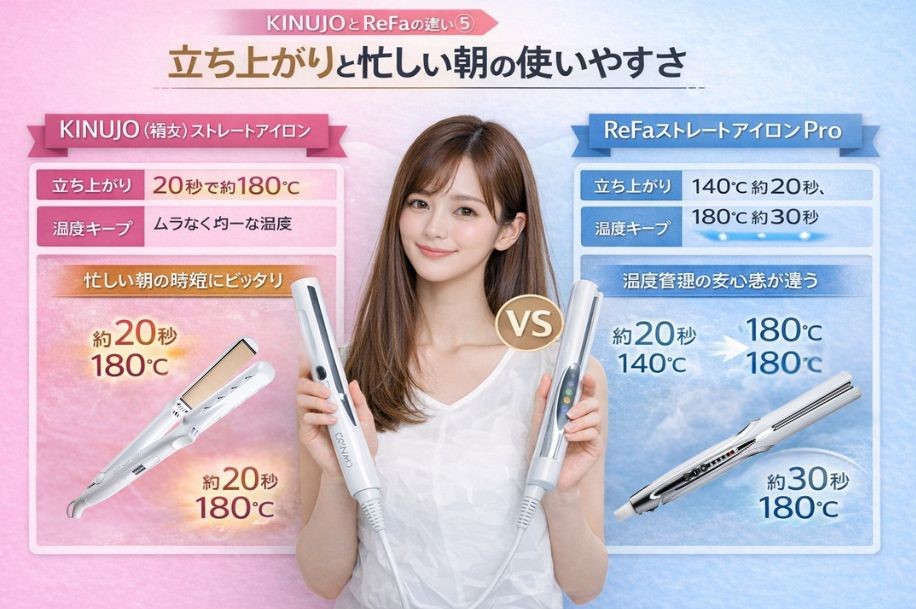 KINUJO(絹女)ストレートアイロンとReFaストレートアイロンProの違い1つ目は、立ち上がりと忙しい朝の使いやすさです。