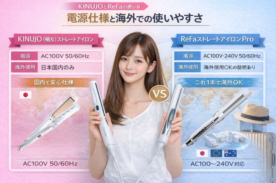 KINUJO(絹女)ストレートアイロンとReFaストレートアイロンProの違い1つ目は、電源仕様と海外での使い方です。