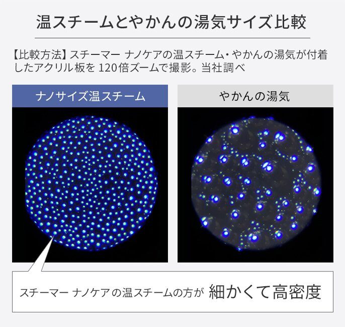 その理由は、ナノケアから放出されるスチームが、通常の水蒸気よりもはるかに微細な「ナノサイズ」のイオンを含んでいるからです。