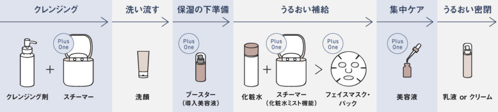 保 湿 時 | スチームを浴びながら美容 液を塗布 | 美容液の浸透をサポートし、肌の奥まで潤い を届ける |
